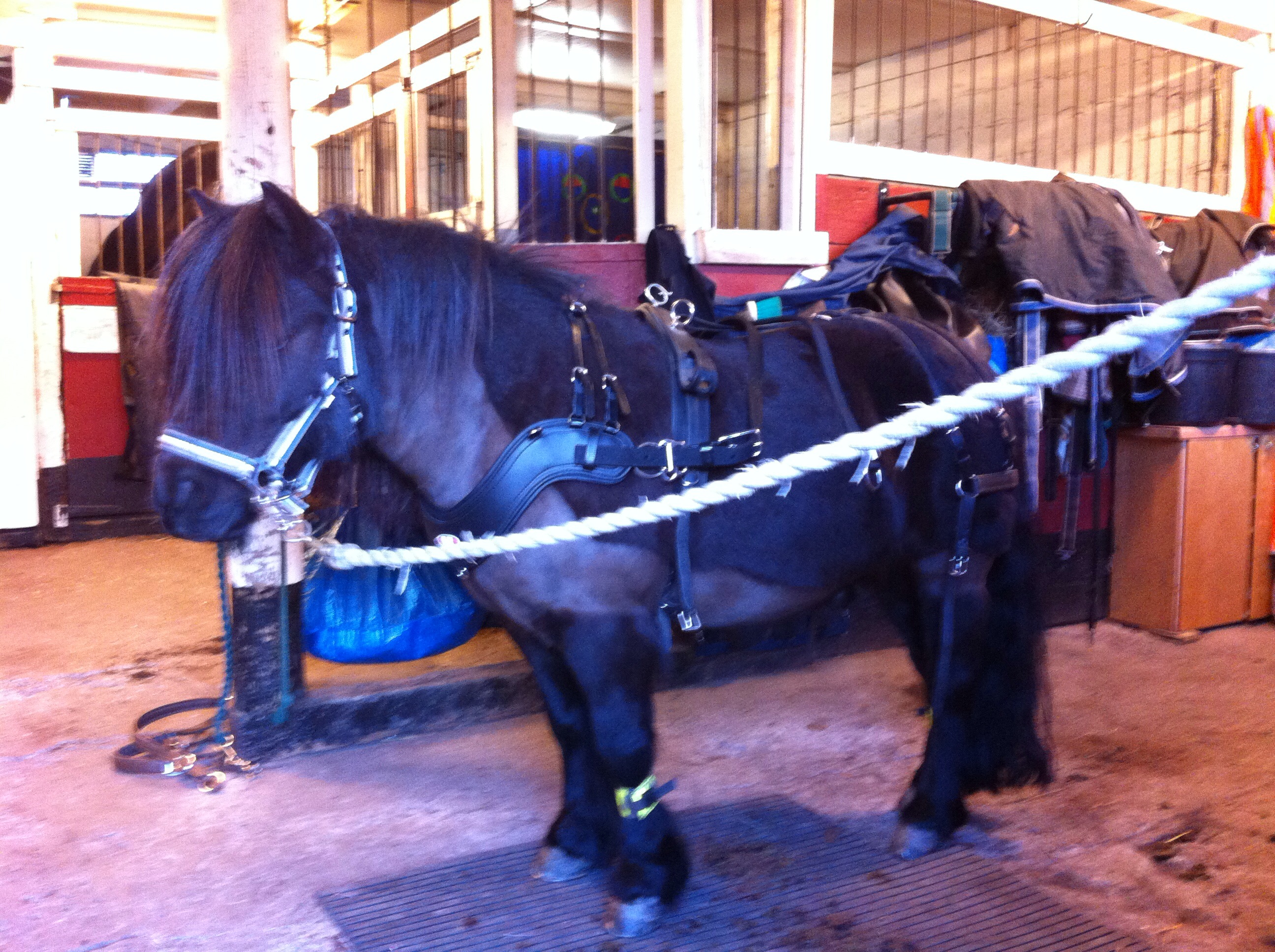 Vi bor i samma hus som ponnyakuten barnen gör och våra hästar står i samma stall som deras ponnier.
