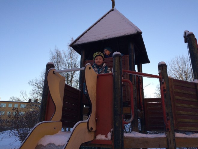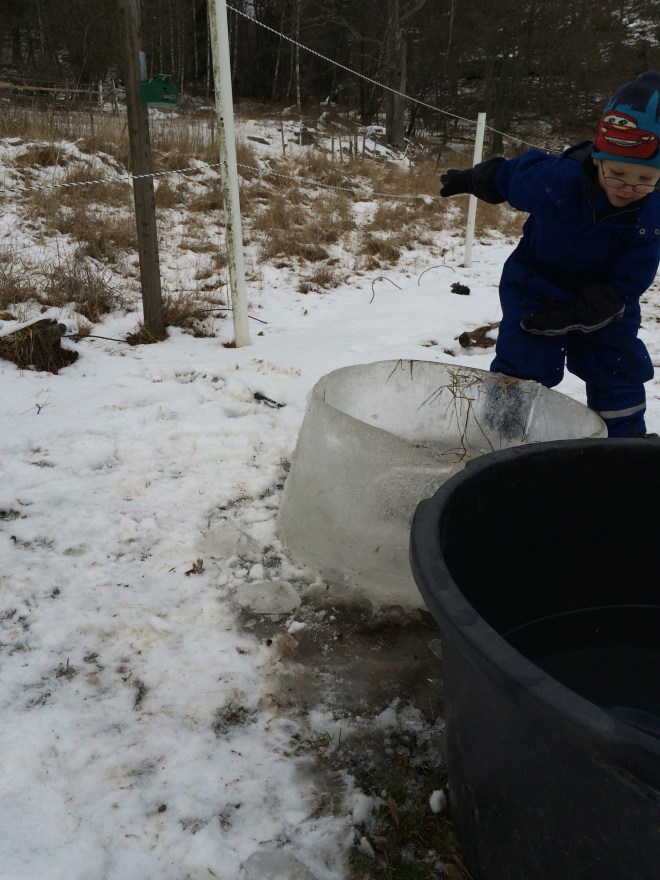 Vi passade även på att ta bort isen ur vattentunnan i hagen. Den var det roligaste på hela dagen enligt barnen, det var som en stor bassäng med hål i botten enligt barnen 😀