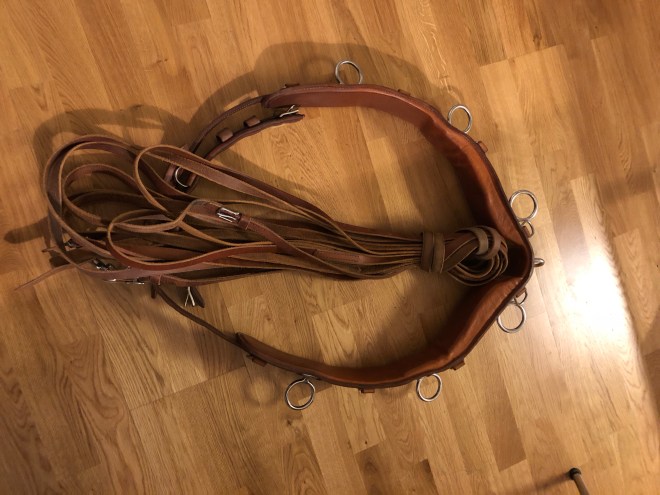 Satt en kväll och önskade mig ett par tömkörningstömmar från Tärnsjö och tittade runt på Facebook och helt plötsligt kom annonsen upp om en Tärnsjö tömkörningsgjord och tömmar till salu. Kunde inte låta bli. Så nu är jag ägare till en tömkörningsgjord i storlek full samt tömmar från Tärnsjö. Nämnde jag att jag är lycklig 😋