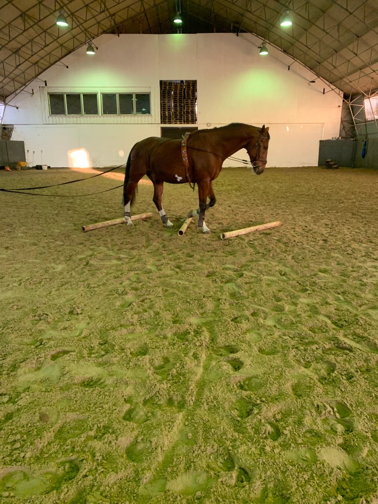 Träna på bommar som inte ligger symmetriskt, mycket att tänka på för både häst och kusk.