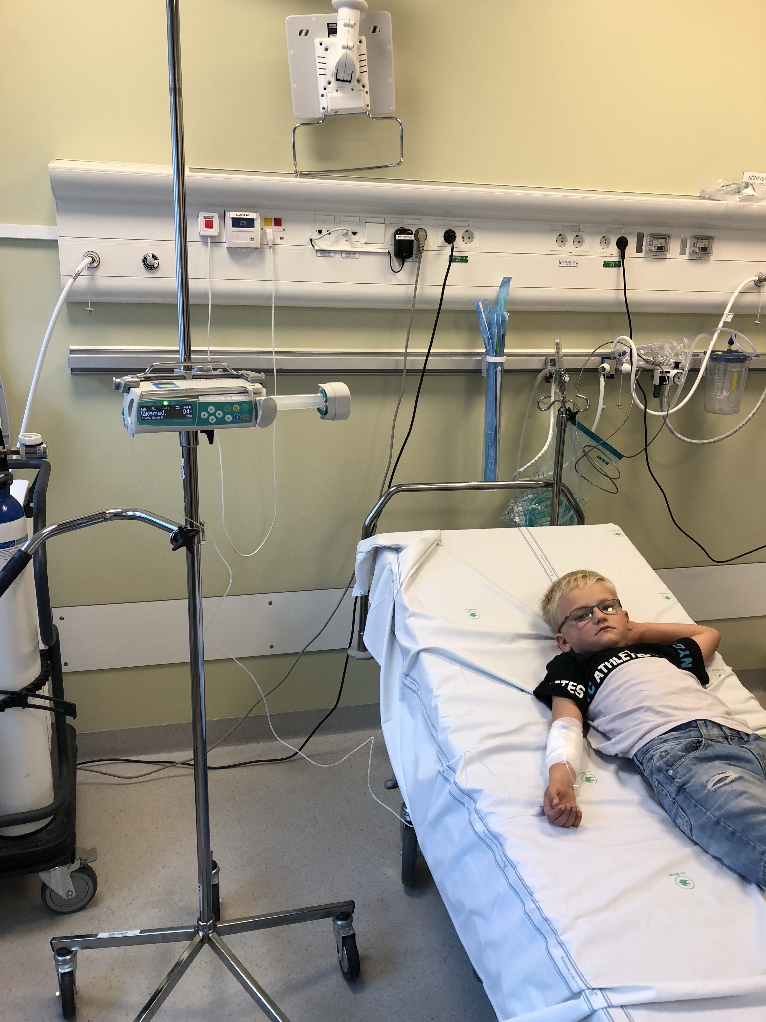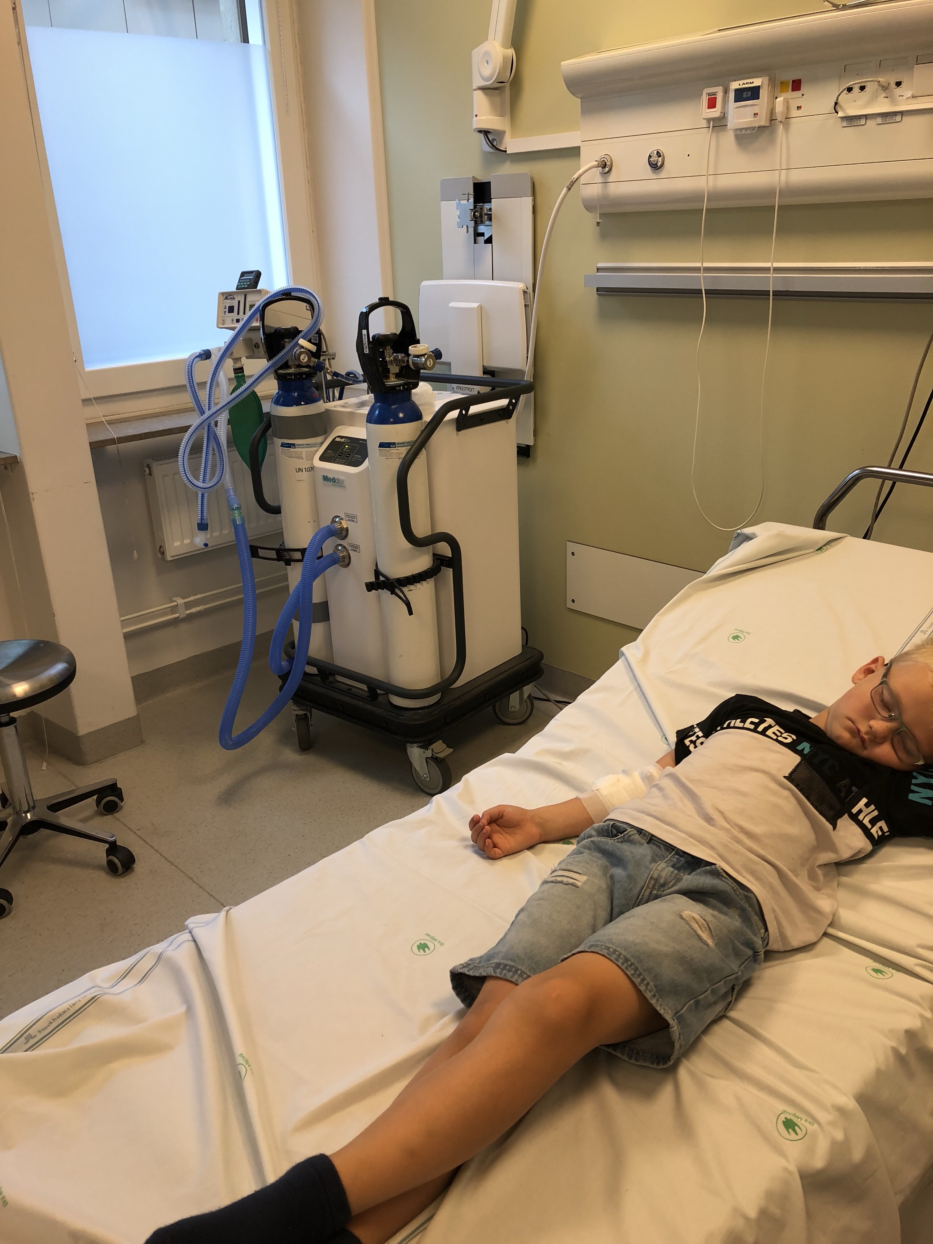 I hörnan ser ni lustgasmaskinen som användes när ryggmärgsprovet skulle tas. Bilden är tagen efter alla prover och vi väntar på resultatet. Marcus somnade en stund efter då det var lugnt och avslappnat i rummet när all personal var ute ur rummet. Han märkte inte när läkaren kom tillbaka ca 1 timme efter provtagningen och berättade att han hade Borrelia.