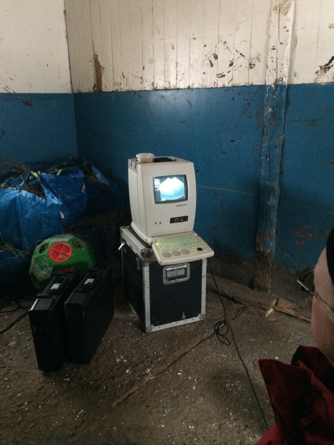 På ultraljudet kunde vi se att det yttre ledbandet fortfarande inte riktigt har läkt helt och hållet. Det är lite blödningar kvar där, men ändå så pass bra att vi kan börja sätta i gång honom i lite skritt och trav rakt fram och så få nedförsbackar som möjligt.
