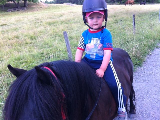 Han har börjat få rätt balans när han sitter på Görans rygg, vilket är kul. Vi travar lite varje gång, men där spänner han sig så han studsar hej vilt på ryggen, men oj va vi skrattar. Än så länge rider vi barbacka så det blir väl lättare när sadeln kommer på och han kan rida lätt.