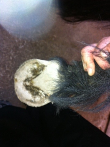 Vi gick ner o hämtade Göran som självklart kom travande till oss. Pontus red upp till stallet och när jag skulle kratsa hovarna saknades en höger baksko. Det var just den skon som hovslagaren hoppades att han inte skulle tappa, då det är den bakhoven vi håller på att justera sen han gått barfota då han har en liten rotation med den hoven när han går.