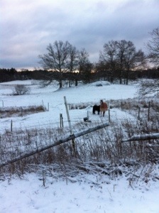 Nu är vintern här iaf i några dagar. Hade utsläppet i morse och efter förkylningen Huberts framfart gick det lite långsammare än normalt, men hästarna verkade ha överseende med mig.